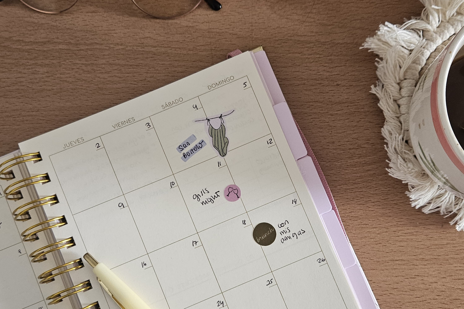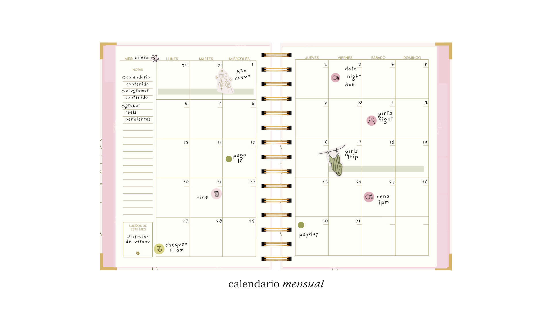 - Calendario mensual para tu registro de fechas importantes, planes bonitos, pagos, fechas límite…