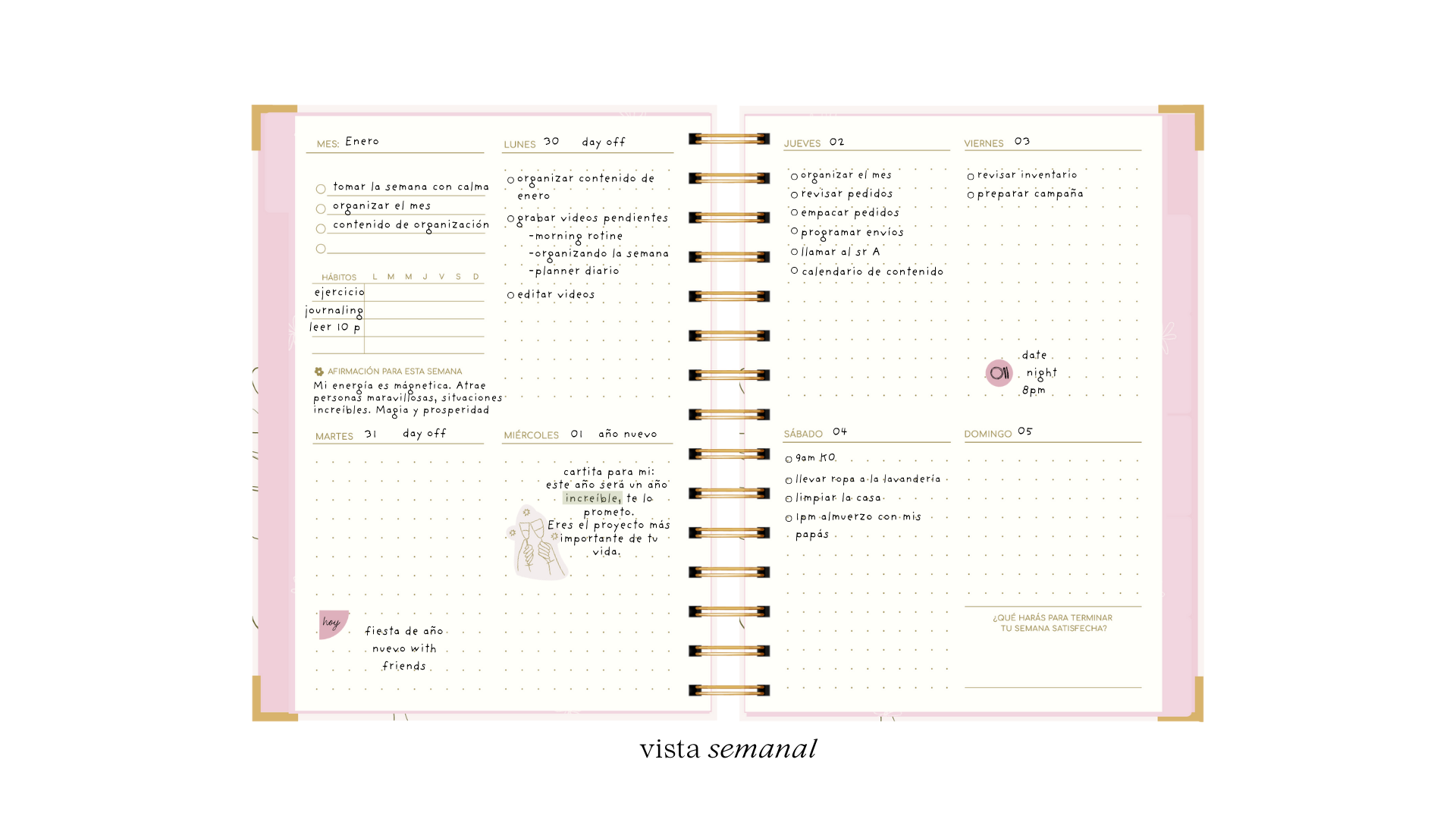 Recuerda que nuestra agenda es atemporal, no tiene fechas. Así puedes organizarte a tu ritmo, y no abandonarla. Además, tiene el tamaño perfecto para llevarlo a todos lados y el formato semanal para tener la vista completa de la semana.