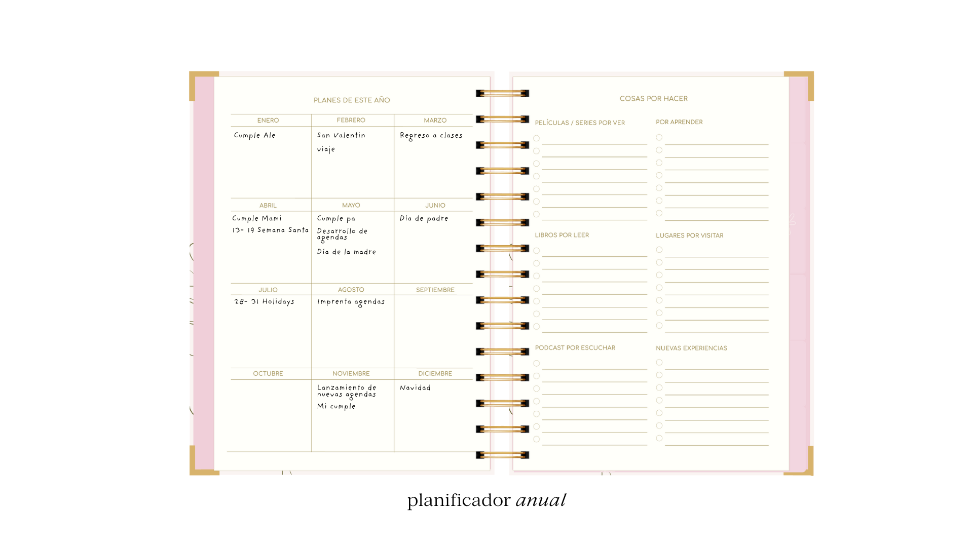 La agenda ideal que te acompañará en los mejores momentos, te ayudará a organizarte, cumplir tus objetivos anuales y ayudarte a crear una rutina diaria que te ayude a cuidar de ti y aprender a vivir un día la vez.