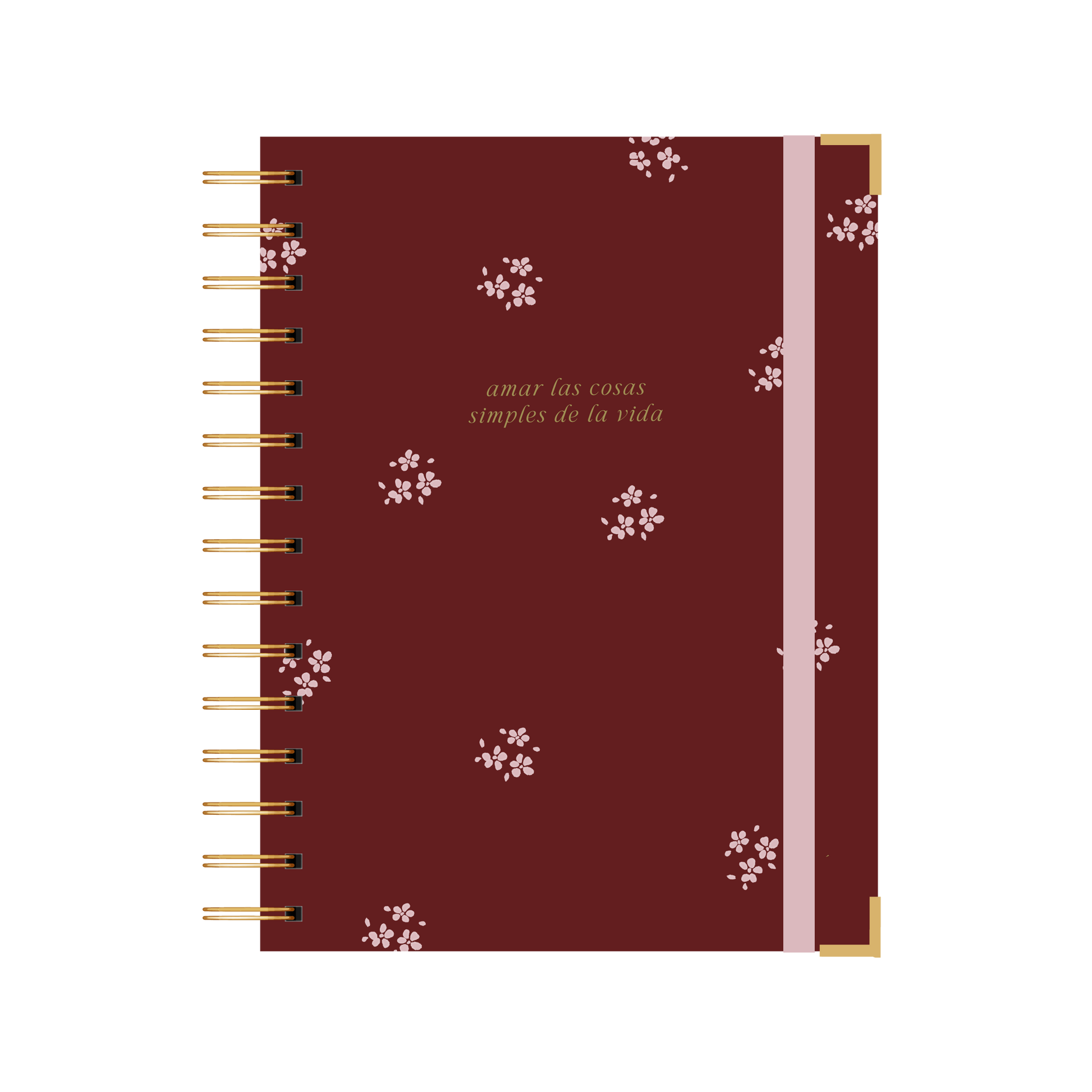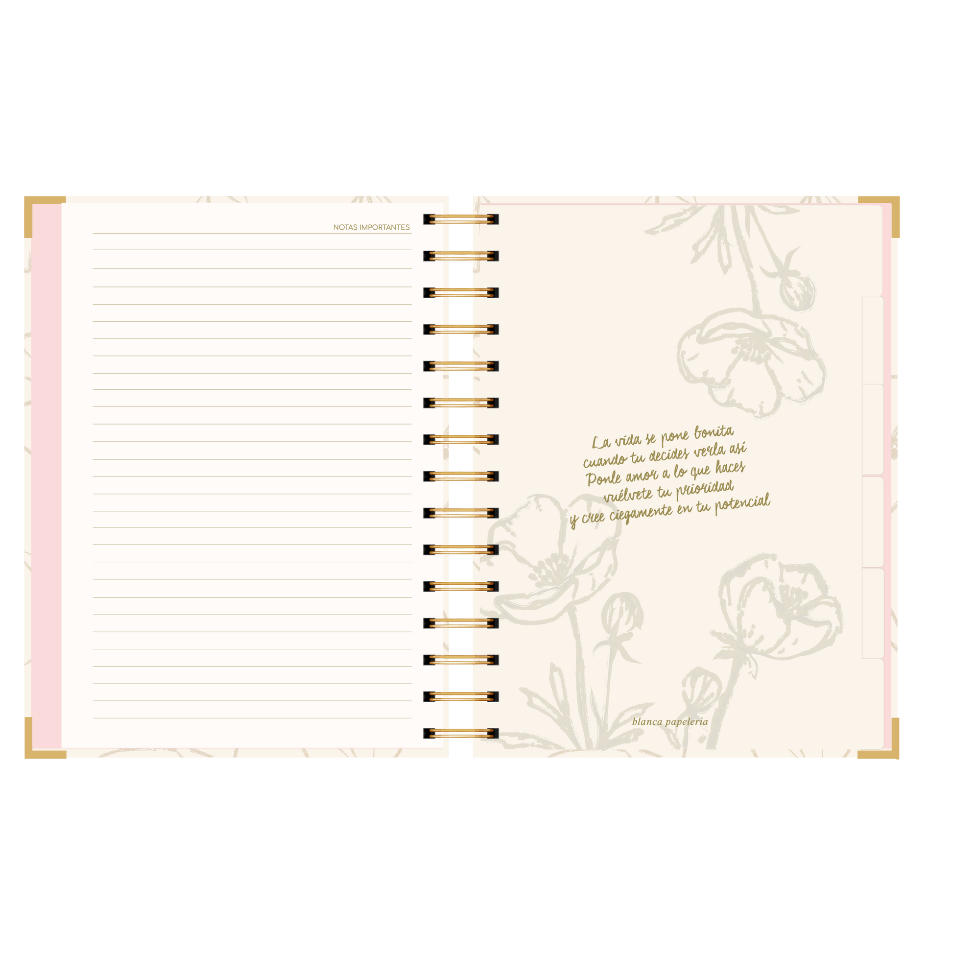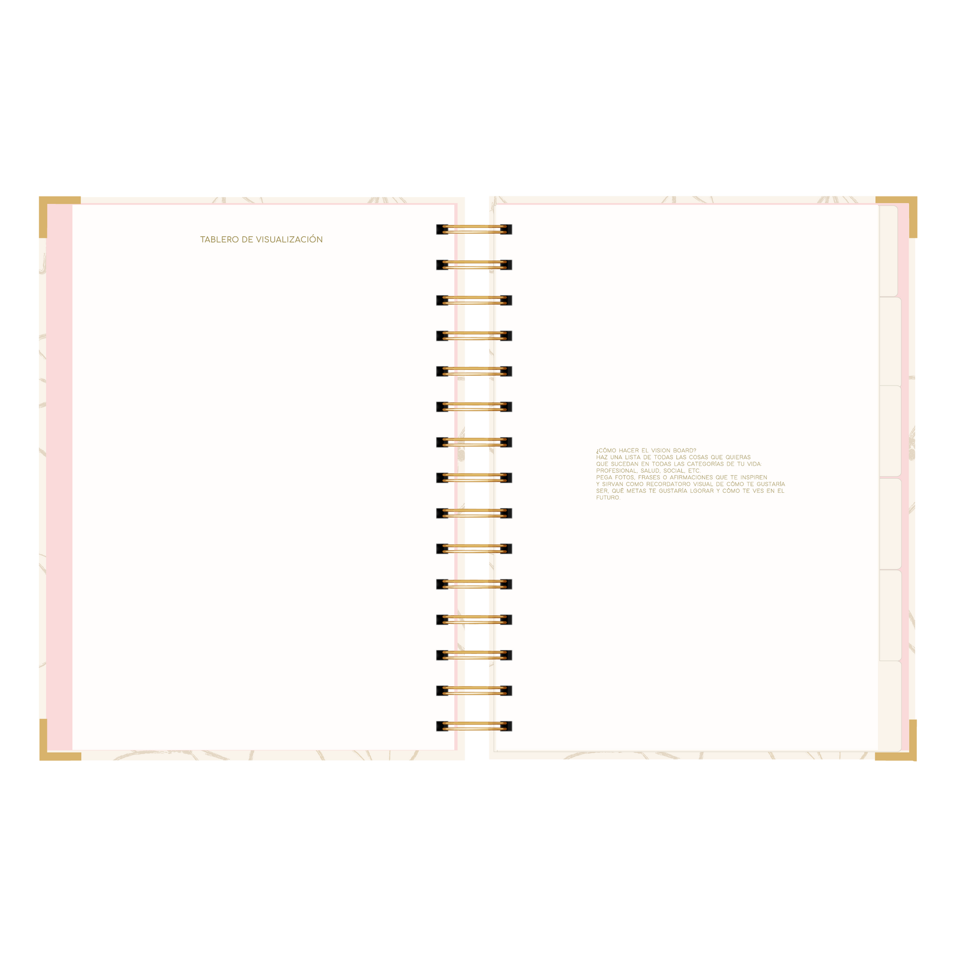 - Detalle de anillado y esquineros dorado.