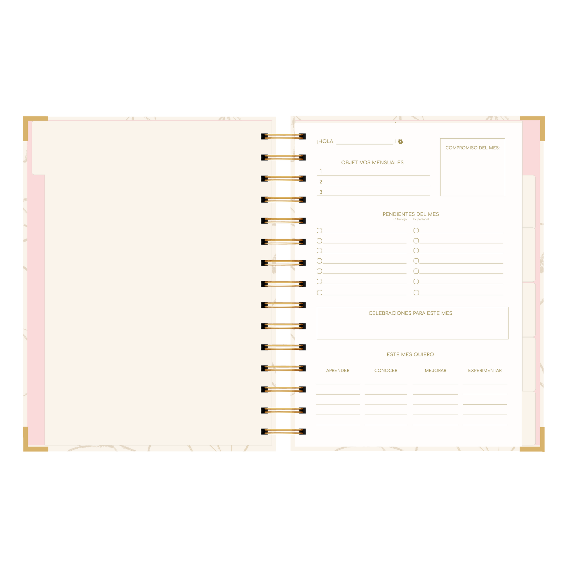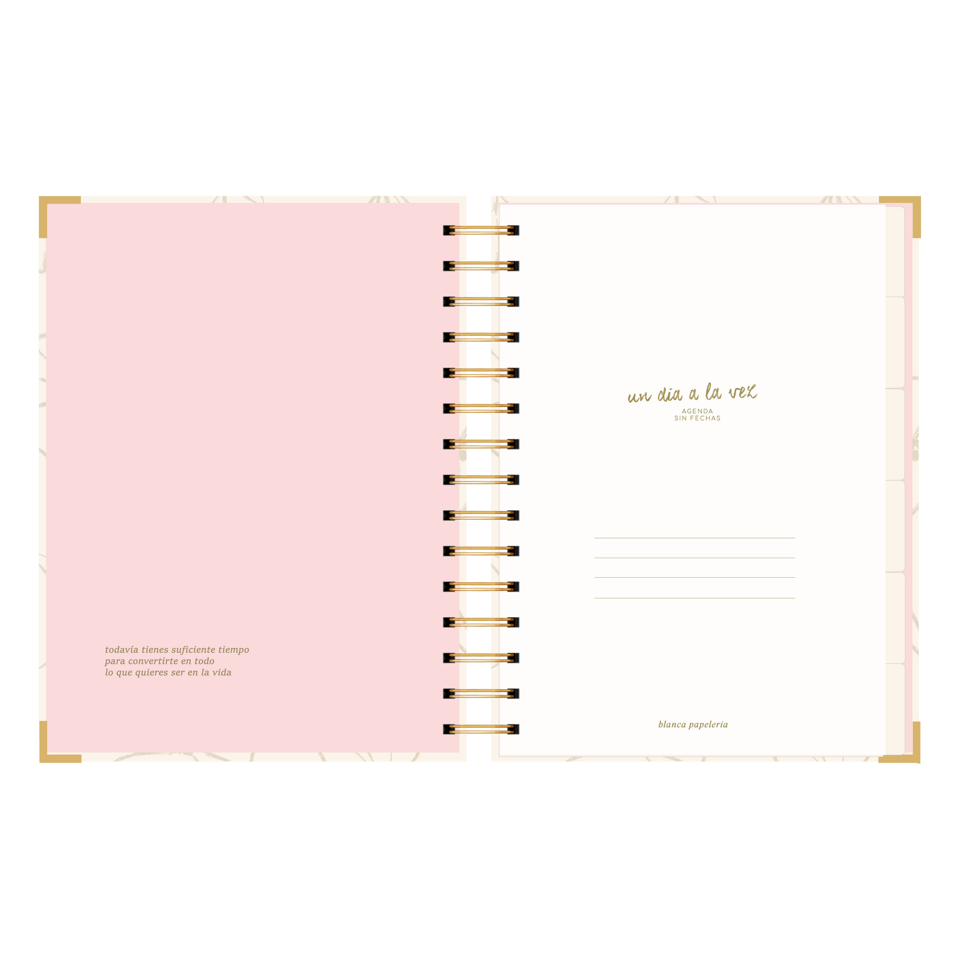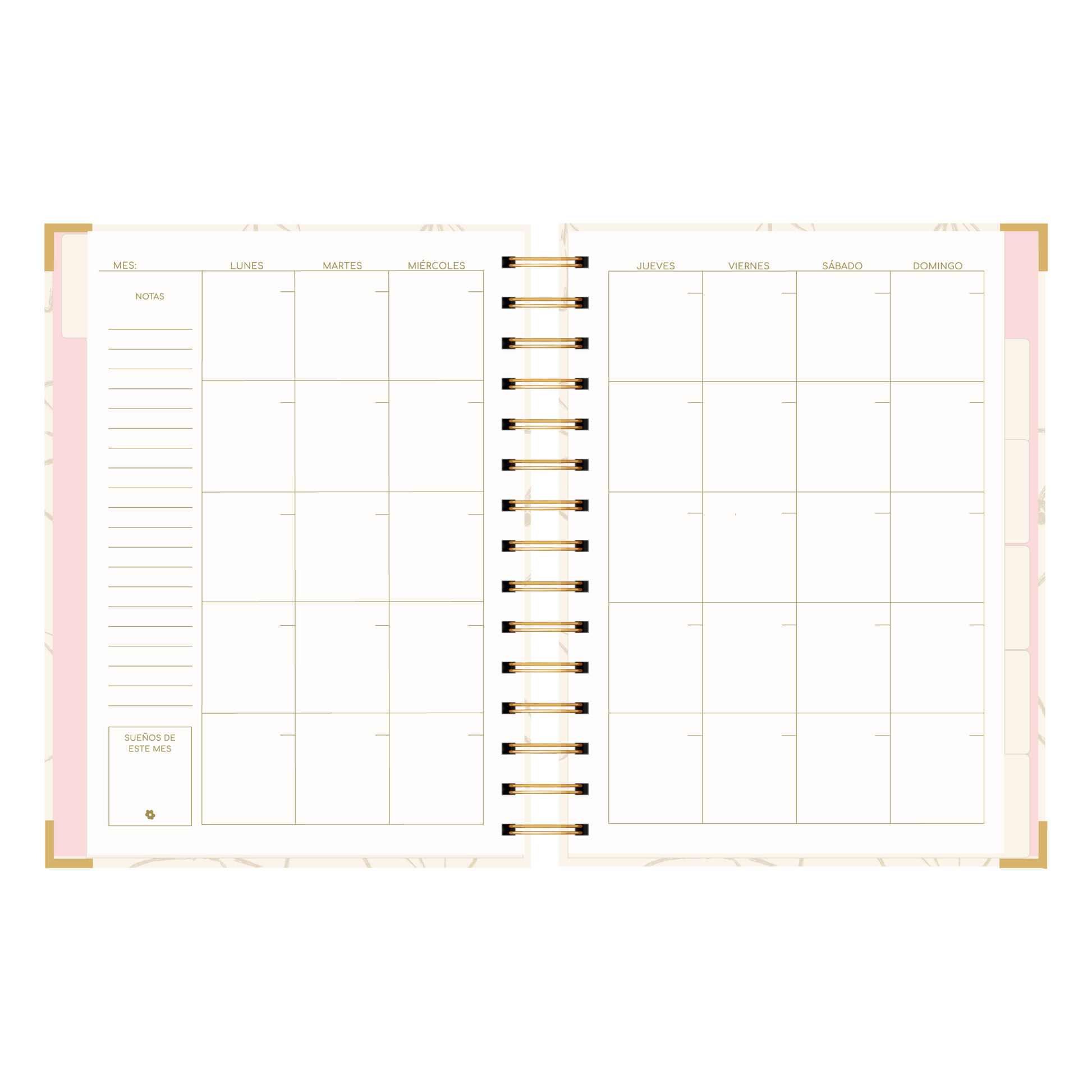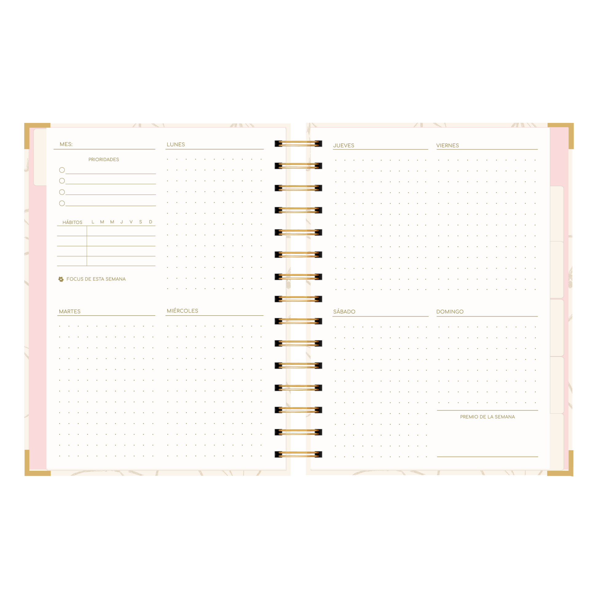 - Detalle de anillado y esquineros dorado.