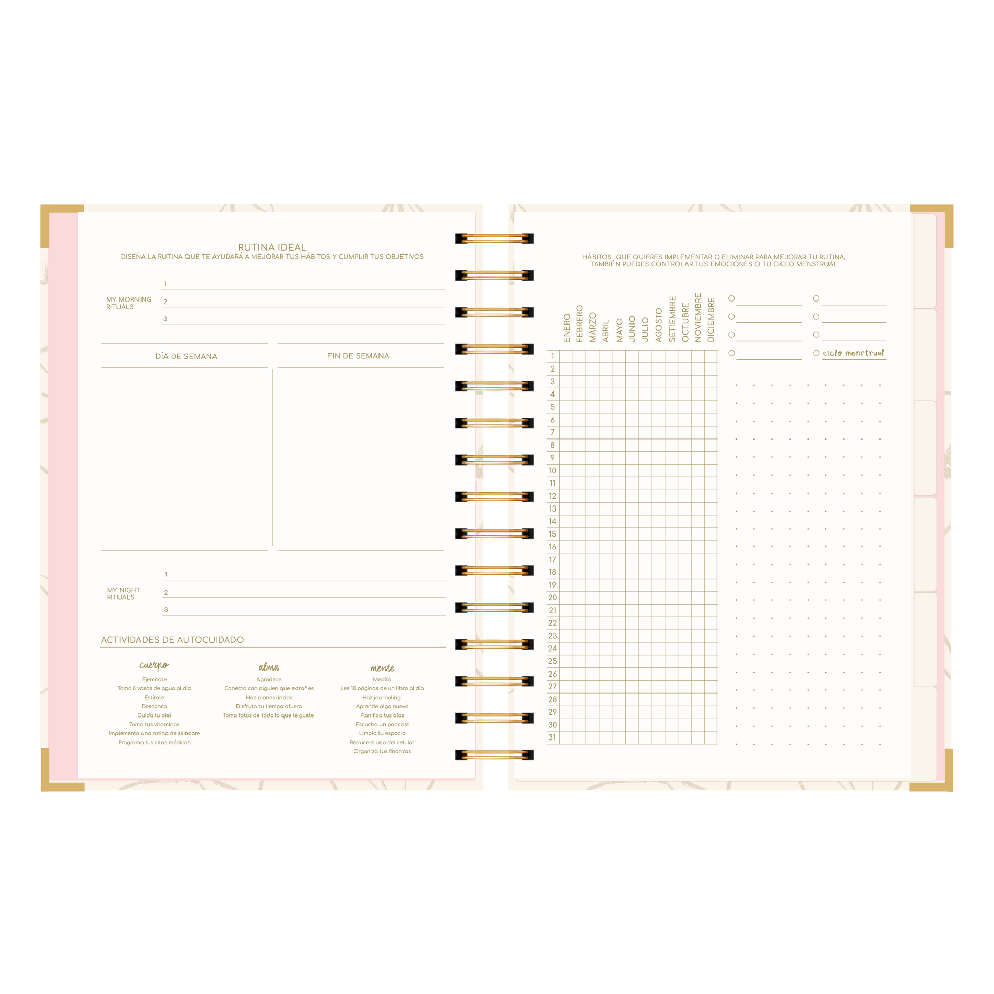 La agenda ideal que te acompañará en los mejores momentos, te ayudará a organizarte, cumplir tus objetivos anuales y ayudarte a crear una rutina diaria que te ayude a cuidar de ti y aprender a vivir un día la vez.